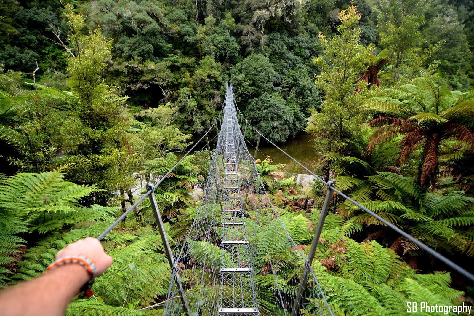 A wire swing bridge over the confluence of the Waiau, one person at a time only!
